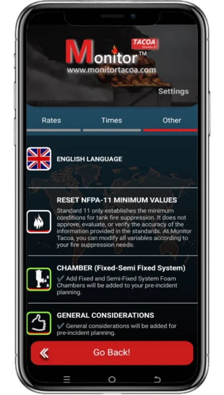 Monitor Tacoa Combina las referencias cruzadas de varias normas y recomendaciones como API, NFPA 11, NFPA 30, LastFire©, FootPrint® de Williams Fire & Hazard Control® y sus resultados son optimizados mediante la adición de recomendaciones generales según características del escenario planteado.